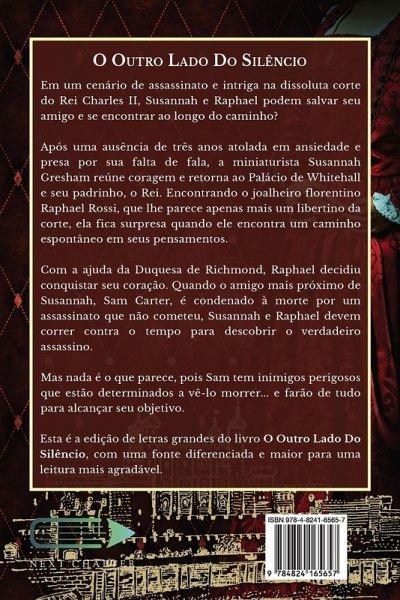 Em um cenário de assassinato e intriga na dissoluta corte do Rei Charles II, Susannah e Raphael podem salvar seu amigo e se encontrar ao longo do caminho? Após uma ausência de três anos atolada em ansiedade e presa por sua falta de fala, a miniaturista Susannah Gresham reúne coragem e retorna ao Palácio de Whitehall e seu padrinho, o Rei. Encontrando o joalheiro florentino Raphael Rossi, que lhe parece apenas mais um libertino da corte, ela fica surpresa quando ele encontra um caminho espontâneo em seus pensamentos. Com a ajuda da Duquesa de Richmond, Raphael decidiu conquistar seu coração. Quando o amigo mais próximo de Susannah, Sam Carter, é condenado à morte por um assassinato que não cometeu, Susannah e Raphael devem correr contra o tempo para descobrir o verdadeiro assassino. Mas nada é o que parece, pois Sam tem inimigos perigosos que estão determinados a vê-lo morrer... e farão de tudo para alcançar seu objetivo. Esta é a edição de letras grandes do livro O Outro Lado Do Silêncio, com uma fonte diferenciada e maior para uma leitura mais agradável.