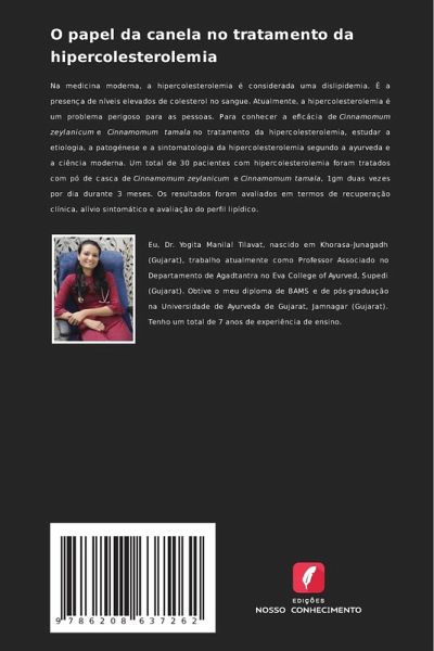 Na medicina moderna, a hipercolesterolemia é considerada uma dislipidemia. É a presença de níveis elevados de colesterol no sangue. Atualmente, a hipercolesterolemia é um problema perigoso para as pessoas. Para conhecer a eficácia de Cinnamomum zeylanicum e Cinnamomum tamala no tratamento da hipercolesterolemia, estudar a etiologia, a patogénese e a sintomatologia da hipercolesterolemia segundo a ayurveda e a ciência moderna. Um total de 30 pacientes com hipercolesterolemia foram tratados com pó de casca de Cinnamomum zeylanicum e Cinnamomum tamala, 1gm duas vezes por dia durante 3 meses. Os resultados foram avaliados em termos de recuperação clínica, alívio sintomático e avaliação do perfil lipídico.