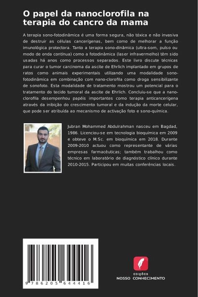 A terapia sono-fotodinâmica é uma forma segura, não tóxica e não invasiva de destruir as células cancerígenas, bem como de melhorar a função imunológica protectora. Tanto a terapia sono-dinâmica (ultra-som, pulso ou modo de onda contínua) como a fotodinâmica (laser infravermelho) têm sido usadas há anos como processos separados. Este livro discute técnicas para curar o tumor carcinoma da ascite de Ehrlich implantado em grupos de ratos como animais experimentais utilizando uma modalidade sono-fotodinâmica em combinação com nano-clorofila como droga sensibilizante de sonofoto. Esta modalidade de tratamento mostrou um potencial para o tratamento do tecido tumoral da ascite de Ehrlich. Concluiu-se que a nano-clorofila desempenhou papéis importantes como terapia anticancerígena através da inibição do crescimento tumoral e da indução da morte celular, que pode ser atribuída ao mecanismo de activação foto e sono-química.