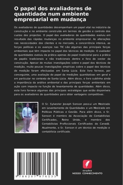 Os avaliadores de quantidades desempenham um papel vital na indústria da construção e no ambiente construído em termos de gestão e controlo dos custos dos projectos. O papel dos avaliadores de quantidades evoluiu em resultado das rápidas mudanças no ambiente empresarial. As alterações nas necessidades dos clientes e no mercado, a concorrência intensa, as forças políticas e os avanços nas TIC são algumas das principais forças ambientais que têm impacto no papel dos técnicos de medição. O avaliador de quantidades evoluiu da prática apenas do papel tradicional para a prática de papéis tradicionais e não tradicionais dentro e fora do sector da construção. Apesar de muitas investigações sobre o papel dos técnicos de medição, muito poucas investigações empíricas sobre o papel dos técnicos de medição foram efectuadas em Santa Lúcia. Este livro fornece, por conseguinte, uma avaliação do papel da medições quantitativas em geral e em particular no contexto de Santa Lúcia. Além disso, o livro sublinha ainda a importância da análise ambiental e das principais forças ambientais em ação com impacto na função de levantamento de quantidades. Além disso, este livro fornece algumas das principais estratégias que estão disponíveis para os avaliadores de quantidades para obter vantagens competitivas.