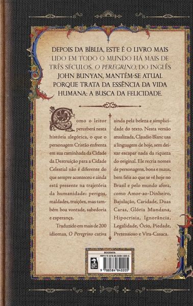 DEPOIS DA BÍBLIA, ESTE É O LIVRO MAIS LIDO EM TODO O MUNDO HÁ MAIS DE TRÊS SÉCULOS. O PEREGRINO, DO INGLÊS JOHN BUNYAN, MANTÉM-SE ATUAL PORQUE TRATA DA ESSÊNCIA DA VIDA HUMANA: A BUSCA DA FELICIDADE C omo o leitor perceberá nesta história alegórica, o que o personagem Cristão enfrenta em sua caminhada da Cidade da Destruição para a Cidade Celestial não é diferente do que sempre aconteceu e ainda está presente na trajetória da humanidade: perigos, maldades, traições, mas também boa vontade, sabedoria e esperança. Traduzido em mais de 200 idiomas, O Peregrino cativa ainda pela beleza e simplicidade do texto. Nesta versão atualizada, Claudio Blanc usa a linguagem de hoje, sem deixar escapar nada da riqueza do original. Ele recria nomes de personagens, bons e maus, bem fiéis ao que se vê hoje no Brasil e pelo mundo afora, como Amor-ao-Dinheiro, Bajulação, Caridade, Duas Caras, Glória Mundana, Hipocrisia, Ignorância, Legalidade, Ócio, Piedade, Pretensioso e Vira-Casaca.
