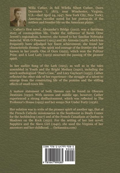 O Pioneers! is a 1913 novel by American author Willa Cather. It was written in part when Cather was living in Cherry Valley, New York, with Isabelle McClung and was completed at the McClungs' home in Pittsburgh. Alexandra Bergson is the main character of the book. A strong-willed and intelligent woman. She was given the farm by her father John Bergson and after 16 years turned it into a very prosperous one. Alexandra isn't very adept at sensing peoples feelings or her own. It takes her a long time to realize that she loves Carl Linstrum. She also doesn't sense Emil's growing attraction toward the unhappily married Marie Shabata. She seems easy to forgive as well, as she claims to have no ill will against Frank, despite the fact he savagely murdered her brother...(wikipedia.org)