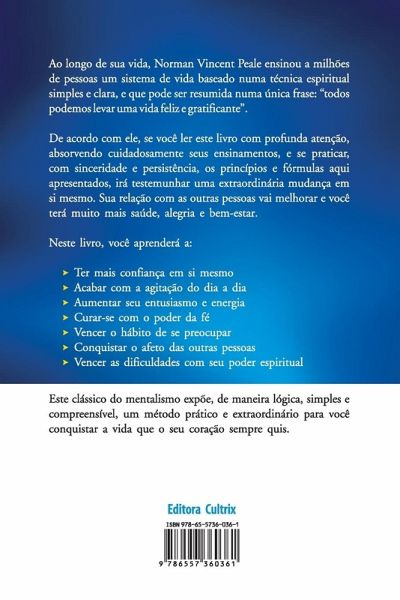 Neste livro, que é o precursor de O Segredo, o autor Norman Vincent Peale ensina um sistema de vida baseado numa técnica espiritual simples e clara, que pode ser resumida numa única frase: todos poderão levar uma vida feliz e gratificante. Se você, diz Peale, ¿ler este livro com profunda atenção, observando cuidadosamente os seus ensinamentos, e se praticar, sincera e persistentemente, os princípios e fórmulas nele expostos, irá experimentar uma extraordinária modificação em si mesmo. Suas relações com as outras pessoas serão melhores e você terá uma nova e agradável sensação de bem-estar.¿