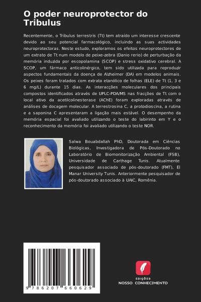 Recentemente, o Tribulus terrestris (Tt) tem atraído um interesse crescente devido ao seu potencial farmacológico, incluindo as suas actividades neuroprotectoras. Neste estudo, exploramos os efeitos neuroprotectores de um extrato de Tt num modelo de peixe-zebra (Danio rerio) de perturbação da memória induzida por escopolamina (SCOP) e stress oxidativo cerebral. A SCOP, um fármaco anticolinérgico, tem sido utilizada para reproduzir aspectos fundamentais da doença de Alzheimer (DA) em modelos animais. Os peixes foram tratados com extrato etanólico de folhas (ELE) de Tt (1, 3 e 6 mg/L) durante 15 dias. As interacções moleculares dos principais compostos identificados através de UPLC-PDA/MS nas fracções de Tt com o local ativo da acetilcolinesterase (AChE) foram exploradas através de análises de docagem molecular. A terrestrosina C, a protodioscina, a rutina e a saponina C apresentaram a ligação mais estável. O desempenho da memória espacial foi avaliado utilizando o teste do labirinto em Y e o reconhecimento da memória foi avaliado utilizando o teste NOR.