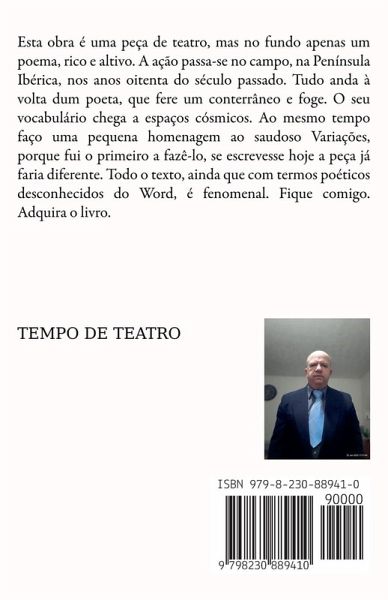 Esta obra é uma peça de teatro, mas no fundo apenas um poema, rico e altivo. A ação passa-se no campo, na Península Ibérica, nos anos oitenta do século passado. Tudo anda à volta dum poeta, que fere um conterrâneo e foge. O seu vocabulário chega, por vezes, a espaços cósmicos. Ao mesmo tempo faço uma pequena homenagem ao saudoso cantor António Variações, porque fui o primeiro a fazê-lo, se escrevesse hoje a peça já faria diferente. Todo o texto, ainda que com termos poéticos desconhecidos do Word, é fenomenal. Incluí também algumas lindas imagens alusivas. Fique comigo. Adquira o livro.