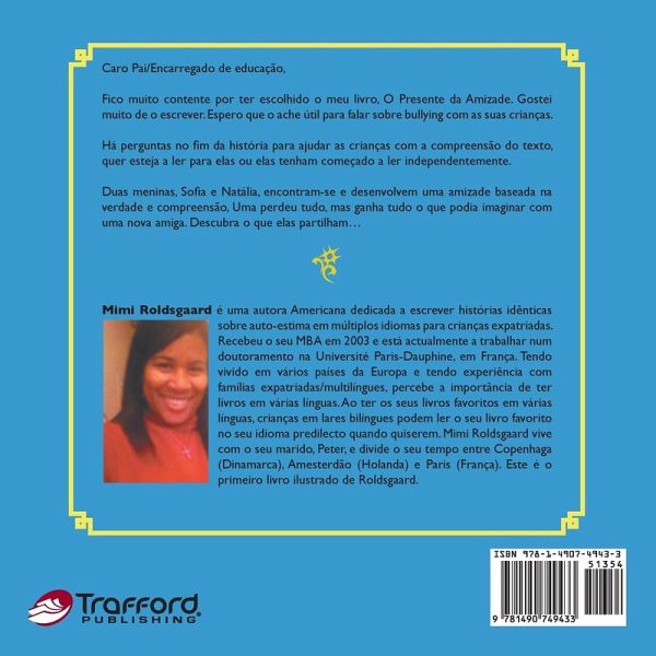 Caro Pai/Encarregado de educação, Fico muito contente por ter escolhido o meu livro, O Presente da Amizade. Gostei muito de o escrever. Espero que o ache útil para falar sobre bullying com as suas crianças. Há perguntas no fim da história para ajudar as crianças com a compreensão do texto, quer esteja a ler para elas ou elas tenham começado a ler independentemente. Duas meninas, Sofia e Natália, encontram-se e desenvolvem uma amizade baseada na verdade e compreensão, Uma perdeu tudo, mas ganha tudo o que podia imaginar com uma nova amiga. Descubra o que elas partilham...