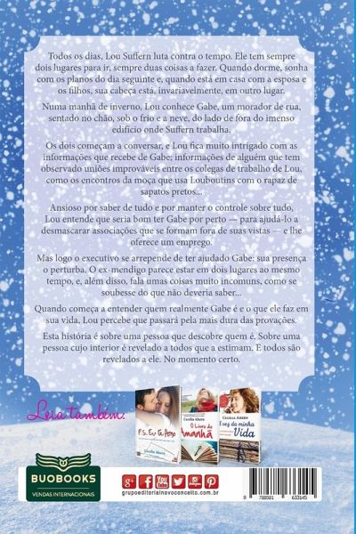 Todos os dias, Lou Suffern luta contra o tempo. Ele tem sempre dois lugares para ir, sempre duas coisas a fazer. Quando dorme, sonha com os planos do dia seguinte e, quando está em casa com a esposa e os filhos, sua cabeça está, invariavelmente, em outro lugar. Numa manhã de inverno, Lou conhece Gabe, um morador de rua, sentado no chão, sob o frio e a neve, do lado de fora do imenso edifício onde Suffern trabalha. Os dois começam a conversar, e Lou fica muito intrigado com as informações que recebe de Gabe; informações de alguém que tem observado uniões improváveis entre os colegas de trabalho de Lou, como os encontros da moça que usa Louboutins com o rapaz de sapatos pretos... Ansioso por saber de tudo e por manter o controle sobre tudo, Lou entende que seria bom ter Gabe por perto - para ajudá-lo a desmascarar associações que se formam fora de suas vistas - e lhe oferece um emprego. Mas logo o executivo se arrepende de ter ajudado Gabe: sua presença o perturba. O ex-mendigo parece estar em dois lugares ao mesmo tempo, e, além disso, fala umas coisas muito incomuns, como se soubesse do que não deveria saber... Quando começa a entender quem realmente Gabe é e o que ele faz em sua vida, Lou percebe que passará pela mais dura das provações. Esta história é sobre uma pessoa que descobre quem é.