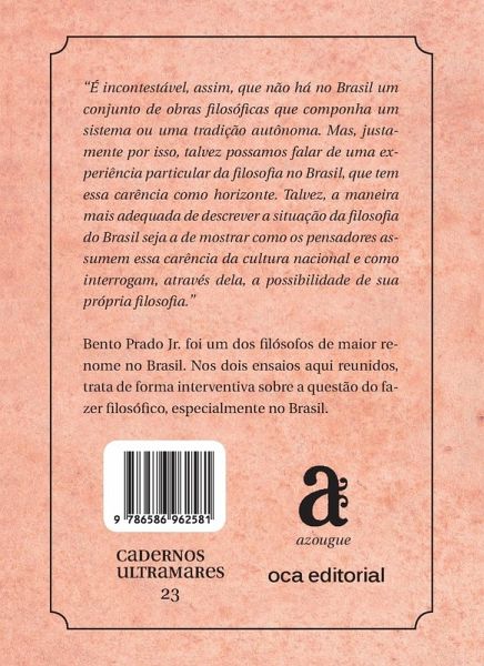 Cadernos Ultramares seeks to present Brazilian culture and thought in a qualified way, through volumes bringing together important essays by renowned authors in different areas of knowledge. Bento Prado Jr. was one of the most renowned philosophers in Brazil. In the two essays collected here, he deals interventively with the question of philosophical work, especially in Brazil.