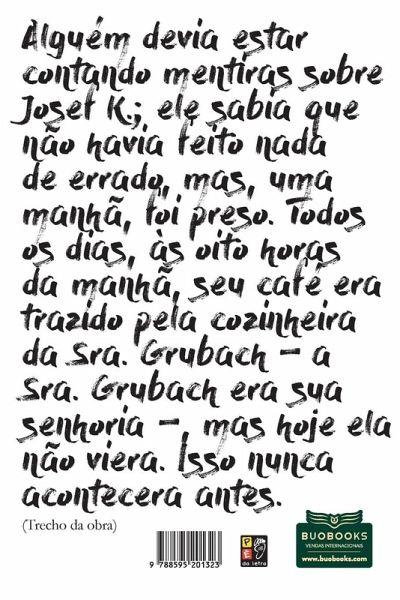 O livro "O Processo", do Autor Franz Kafra, de língua Alemã e considerado talvez o escrito mais influente do século 20, conta a história de Joset K.j. Um desconhecido começa a contar algumas mentiras sobre ele que não havia feito nada de errado, até que numa manhã, foi preso. Todos os dias, às oito horas da manhã, seu café era trazia pela cozinheira da Sra. Grubach, a Sra. Grubach era sua senhoria, mas hoje ela não viera. Isso nunca aconteceu antes.
