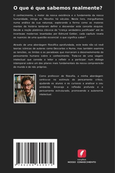 O conhecimento, o motor da nossa existência e o fundamento da nossa humanidade, intriga os filósofos há séculos. Neste livro, mergulhamos numa análise da sua natureza, explorando a forma como as maiores mentes da história tentaram definir e desvendar este conceito esquivo. Desde a noção platónica clássica de "crença verdadeira justificada" até às incertezas modernas levantadas por Edmund Gettier, cada capítulo revela as nuances de uma questão essencial: o que significa saber?Através de uma abordagem filosófica aprofundada, este texto não só revê teorias icónicas de autores como Descartes e Hume, mas também examina as tensões, os limites e os paradoxos que marcaram o desenvolvimento do pensamento humano sobre o conhecimento. Trata-se de uma viagem intelectual que convida o leitor a refletir e a participar num diálogo intemporal sobre um dos pilares mais fundamentais da nossa compreensão do mundo e de nós próprios.