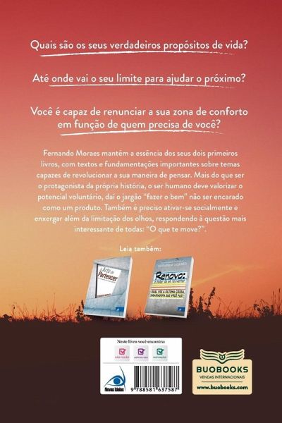Em O que te move?, Fernando Moraes convida o leitor a se mover em busca de novos desafios, a ter atitudes que inspiram grandes transformações e, o mais importante, que nos dê a certeza de que podemos fazer e refazer novos caminhos em busca da nossa felicidade. O que te move é o que te inspira! Fernando Moraes mantém a essência dos seus dois primeiros livros, com textos e fundamentações importantes sobre temas capazes de revolucionar a sua maneira de pensar. Movimentar-se para não ficar aprisionado à zona de conforto é um dos grandes desafios nos tempos modernos. Quando a abundância impera, certamente a visão de futuro fica mais comprometida, por isso se faz necessário nos movermos para ter propósitos, sonhos e esperança de dias melhores. Saindo do estado conformista, que anula as possibilidades e nos imobiliza por causa do imediatismo, ser protagonista é mais do que ser o ator principal de tudo aquilo que envolve a nossa vida. Ser protagonista é colocar o coração no sofrimento do outro, renunciando a zona de conforto em função de quem precisa de nós. Movimentar um sonho, uma causa, um ideal ou um propósito de vida nos permite despertar para novas oportunidades, aflorando talentos, habilidades, dons e potenciais, nos dando confiança e coragem para seguir em frente.