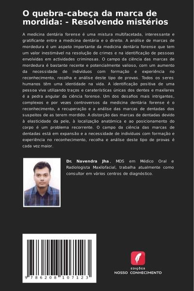 A medicina dentária forense é uma mistura multifacetada, interessante e gratificante entre a medicina dentária e o direito. A análise de marcas de mordedura é um aspeto importante da medicina dentária forense que tem um valor inestimável na resolução de crimes e na identificação de pessoas envolvidas em actividades criminosas. O campo da ciência das marcas de mordedura é bastante recente e potencialmente valioso, com um aumento da necessidade de indivíduos com formação e experiência no reconhecimento, recolha e análise deste tipo de provas. Todos os seres humanos têm uma identidade na vida. A identificação positiva de uma pessoa viva utilizando traços e caraterísticas únicas dos dentes e maxilares é a pedra angular da ciência forense. Um dos desafios mais intrigantes, complexos e por vezes controversos da medicina dentária forense é o reconhecimento, a recuperação e a análise das marcas de dentadas dos suspeitos de as terem mordido. A distorção das marcas de dentadas devido à elasticidade da pele, à localização anatómica e ao posicionamento do corpo é um problema recorrente. O campo da ciência das marcas de dentadas está em expansão e a necessidade de indivíduos com formação e experiência no reconhecimento, recolha e análise deste tipo de provas é cada vez maior.