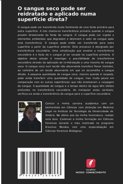 O sangue pode ser transferido muito facilmente de uma fonte primária para outra superfície. A isto chama-se transferência primária quando o sangue provém diretamente da fonte de sangria. O sangue pode ser sujeito a elementos ambientais que degradam e destroem o valor do sangue após esta transferência. O sangue pode então ser transferido para outra superfície a partir da superfície anterior. Este processo é designado por transferência secundária. Uma complicação que envolve a transferência secundária é o facto de o sangue já ter secado na superfície primária. O objetivo deste estudo é investigar a possibilidade de transferência secundária através da aplicação de re-hidratação a uma mancha de sangue seca. O sangue seco num tecido não absorvente transfere flocos húmidos, ao contrário de um tecido absorvente em que se assemelha a sangue diluído. A pequena quantidade de sangue seco, mesmo quando é raspada, pode ainda transferir uma quantidade de sangue, mas muito pouco em comparação com as outras experiências que não envolveram a raspagem de sangue. A quantidade de sangue e o tempo dentro da água têm efeitos profundos na transferência secundária. Ao manipular estas variáveis, verificou-se ainda a transferência de sangue para a superfície secundária.