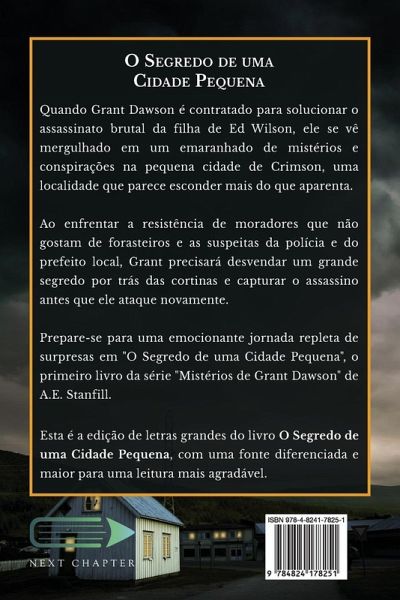 Quando Grant Dawson é contratado para solucionar o assassinato brutal da filha de Ed Wilson, ele se vê mergulhado em um emaranhado de mistérios e conspirações na pequena cidade de Crimson, uma localidade que parece esconder mais do que aparenta. Ao enfrentar a resistência de moradores que não gostam de forasteiros e as suspeitas da polícia e do prefeito local, Grant precisará desvendar um grande segredo por trás das cortinas e capturar o assassino antes que ele ataque novamente. Prepare-se para uma emocionante jornada repleta de surpresas em "O Segredo de uma Cidade Pequena", o primeiro livro da série "Mistérios de Grant Dawson" de A.E. Stanfill. Esta é a edição de letras grandes do livro O Segredo de uma Cidade Pequena, com uma fonte diferenciada e maior para uma leitura mais agradável.