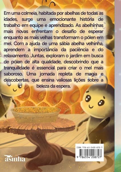 Em uma colmeia, habitada por abelhas de todas as idades, surge uma emocionante história de trabalho em equipe e aprendizado. As abelhinhas mais novas enfrentam o desafio de esperar enquanto as mais velhas transformam o pólen em mel. Com a ajuda de uma sábia abelha velhinha, aprendem a importância da paciência e do relaxamento. Juntas, exploram o jardim em busca de pólen de alta qualidade, descobrindo que a tranquilidade é essencial para criar o mel mais saboroso. Uma jornada repleta de magia e descobertas, que ensina valiosas lições sobre a beleza da espera.