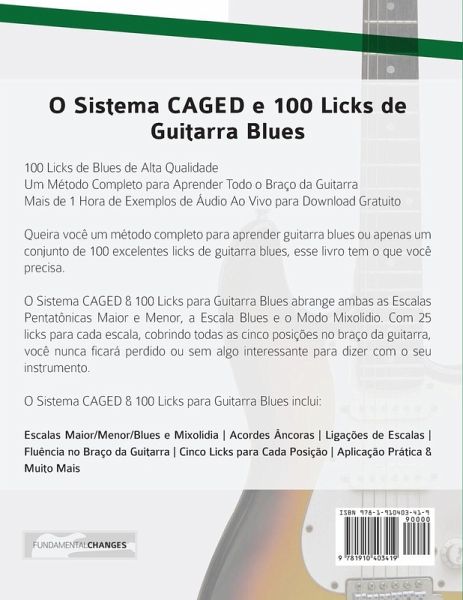 100 Licks de Blues de Alta Qualidade Um Me¿todo Completo para Aprender Todo o Brac¿o da Guitarra Mais de 1 Hora de Exemplos de A¿udio Ao Vivo para Download Gratuito Queira voce¿ um me¿todo completo para aprender guitarra blues ou apenas um conjunto de 100 excelentes licks de guitarra blues, esse livro tem o que voce¿ precisa. O Sistema CAGED & 100 Licks para Guitarra Blues abrange ambas as Escalas Pentatönicas Maior e Menor, a Escala Blues e o Modo Mixoli¿dio. Com 25 licks para cada escala, cobrindo todas as cinco posic¿öes no brac¿o da guitarra, voce¿ nunca ficarä perdido ou sem algo interessante para dizer com o seu instrumento. O Sistema CAGED & 100 Licks para Guitarra Blues inclui: Escalas Maior/Menor/Blues e Mixoli¿dia Acordes A¿ncoras Ligac¿öes de Escalas Flue¿ncia no Brac¿o da Guitarra Cinco Licks para Cada Posic¿äo Aplicac¿äo Prätica & Muito Mais