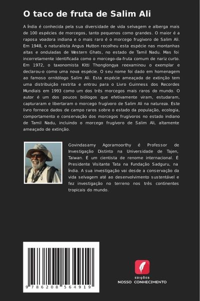 A Índia é conhecida pela sua diversidade de vida selvagem e alberga mais de 100 espécies de morcegos, tanto pequenos como grandes. O maior é a raposa voadora indiana e o mais raro é o morcego frugívoro de Salim Ali. Em 1948, o naturalista Angus Hutton recolheu esta espécie nas montanhas altas e onduladas de Western Ghats, no estado de Tamil Nadu. Mas foi incorretamente identificada como o morcego-da-fruta comum de nariz curto. Em 1972, o taxonomista Kitti Thonglongya reexaminou o exemplar e declarou-o como uma nova espécie. O seu nome foi dado em homenagem ao famoso ornitólogo Salim Ali. Esta espécie ameaçada de extinção tem uma distribuição restrita e entrou para o Livro Guinness dos Recordes Mundiais em 1993 como um dos três morcegos mais raros do mundo. O autor é um dos poucos biólogos que efetivamente viram, estudaram, capturaram e libertaram o morcego frugívoro de Salim Ali na natureza. Este livro fornece dados de campo raros sobre o estado da população, ecologia, comportamento e conservação dos morcegos frugívoros no estado indiano de Tamil Nadu, incluindo o morcego frugívoro de Salim Ali, altamente ameaçado de extinção.