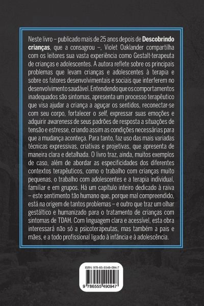 Neste livro ¿ publicado mais de 25 anos depois de Descobrindo crianças, que a consagrou ¿, Violet Oaklander compartilha com os leitores sua vasta experiência como Gestalt-terapeuta de crianças e adolescentes. A autora reflete sobre os principais problemas que levam crianças e adolescentes à terapia e sobre os fatores desenvolvimentais e sociais que interferem no desenvolvimento saudável. Entendendo que os comportamentos inadequados são sintomas, apresenta um processo terapêutico que visa ajudar a criança a aguçar os sentidos, reconectar-se com seu corpo, fortalecer o self, expressar suas emoções e adquirir awareness de seus padrões de resposta a situações de tensão e estresse, criando assim as condições necessárias para que a mudança aconteça. Para tanto, faz uso das mais variadas técnicas expressivas, criativas e projetivas, que apresenta de maneira clara e detalhada. O livro traz, ainda, muitos exemplos de caso, além de abordar as especificidades dos diferentes contextos terapêuticos, como o trabalho com crianças muito pequenas, o trabalho com adolescentes e a terapia individual, familiar e em grupos. Há um capítulo inteiro dedicado à raiva ¿ este sentimento tão humano que, porque mal compreendido, está na origem de tantos problemas ¿ e outro que traz um olhar gestáltico e humanizado para o tratamento de crianças com sintomas de TDAH. Com linguagem clara e acessível, esta obra interessará não só a psicoterapeutas, mas também a pais e mães, e a todo profissional ligado à infância e à adolescência.