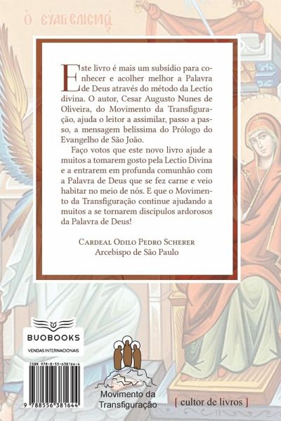 Este livro é mais um subsídio para conhecer e acolher melhor a Palavra de deus através do método da Lectio divina. O autor, Cesar Augusto Nunes de Oliveira, do Movimento da Transfiguração, ajuda o leitor a assimilar, passo a passo, a mensagem belíssima do Prólogo do Evangelho de São João.