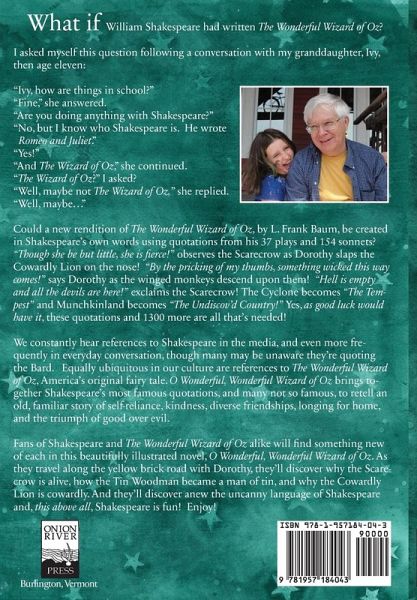 The Wonderful Wizard of Oz, the original American fairy tale by L. Frank Baum, is an old tale told new, time and time again, in the years since it was first published in 1900. In this new rendition of Baum's familiar story, the wisdom and truths in Shakespeare's plays have been overlaid onto the tale of Dorothy's adventure in the Land of Oz. Baum's aim was not to lecture or impart a particular moral, but to entertain and amuse. Yet The Wonderful Wizard of Oz does more, and O Wonderful, Wonderful Wizard of Oz does more as well. It demonstrates the intrinsic value of the foundational virtue of kindness and introduces young readers to hundreds of Shakespeare's most famous lines, truths, and bits of wisdom as Dorothy travels along the yellow brick road. Hopefully, readers of all ages will come to the end of the beautifully illustrated O Wonderful, Wonderful Wizard of Oz and think, "Shakespeare is fun!" and so anticipate their next encounter of the Bard of Avon with eagerness and positivity. Perhaps, as well, readers will reflect on how Dorothy changed lives, and even Oz itself, by her choice to be kind to those she meets who are hurting or alone, and to offer them what help she can, with no thought of what she might receive in return. For kindness stands in stark contrast to rudeness or indifference. It has the power to connect us and surprise us, and to inspire friendship, loyalty, gratitude, hope, and even love to make our lives a little happier and a little easier. We could all use more of that!
