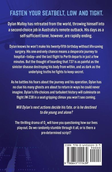 ONE SECOND... ONE BREATH... ONE CHANCE Fasten your seatbelt low and tight for an aviation and medical thriller that'll grip your mind and capture your heart. Dylan Malloy has retreated from the world, throwing himself into a second choice job in Australia's remote outback. His days as a self-sufficient loner, however, are rapidly ending. Dylan knows he won't make his twenty-fifth birthday without life saving surgery. His one-and-only chance means a desperate journey to hospital-today-and the last flight to Perth departs in just a few minutes. But the thought of boarding that 737 is as painful as the sinister disease destroying his body from within, and as dark as the underlying truths he fights to keep secret. As he battles his fears about the journey and his operation, Dylan has no clue his many ghosts are about to return in ways he could never imagine. Dylan's life-choices and turbulent history will culminate on flight JW-238 in a seat gripping climax you won't see coming. Will Dylan's next actions decide his fate, or is he destined to die young and alone? The thrilling drama of O2 will have you questioning how our lives play out. Do we randomly stumble through it all, or is there a predetermined script?