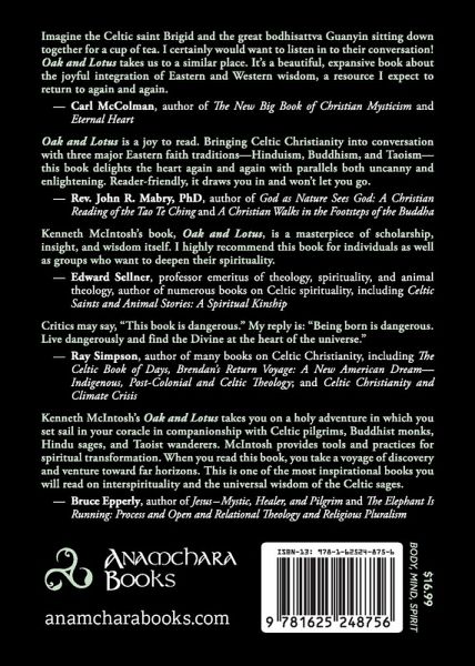 Imagine the Celtic saint Brigid and the great bodhisattva Guanyin sitting down together for a cup of tea. I certainly would want to listen in to their conversation! Oak and Lotus takes us to a similar place. It's a beautiful, expansive book about the joyful integration of Eastern and Western wisdom, a resource I expect to return to again and again. - Carl McColman, author of The New Big Book of Christian Mysticism and Eternal Heart Oak and Lotus is a joy to read. Bringing Celtic Christianity into conversation with three major Eastern faith traditions-Hinduism, Buddhism, and Taoism-this book delights the heart again and again with parallels both uncanny and enlightening. Reader-friendly, it draws you in and won't let you go. - Rev. John R. Mabry, PhD, author of God as Nature Sees God: A Christian Reading of the Tao Te Ching and A Christian Walks in the Footsteps of the Buddha Kenneth McIntosh's book, Oak and Lotus, is a masterpiece of scholarship, insight, and wisdom itself, focusing on the mystic heart of Celtic Christian and three major spiritual traditions of Asia. I highly recommend this book for individuals as well as groups who want to deepen their spirituality. - Edward Sellner, professor emeritus of theology, spirituality, and animal theology, author of numerous books on Celtic spirituality, including Celtic Saints and Animal Stories: A Spiritual Kinship Critics may say, "This book is dangerous." My reply is: "Being born is dangerous. Live dangerously and find the Divine at the heart of the universe." - Ray Simpson, author of many books on Celtic Christianity, including The Celtic Book of Day, Brendan's Return Voyage: A New American Dream-Indigenous, Post-Colonial and Celtic Theology, and Celtic Christianity and Climate Crisis Kenneth McIntosh's Oak and Lotus takes you on a holy adventure in which you set sail on your coracle in companionship with Celtic pilgrims, Buddhist monks, Hindu sages, and Taoist wanderers. On your journey, you may catch a glimpse and receive guidance from Brigid of Kildare, St. Brendan, Gautama Buddha, and Lao Tzu. McIntosh describes a spiritual path, and more than that, he provides tools and practices for spiritual transformation. When you read this book, you take a voyage of discovery and venture toward far horizons. This is one of the most inspirational books you will read on interspirituality and the universal wisdom of the Celtic sages. - Bruce Epperly, author of Jesus - Mystic, Healer, and Prophet and The Elephant is Running: Process and Open and Relational Theology and Religious Pluralism