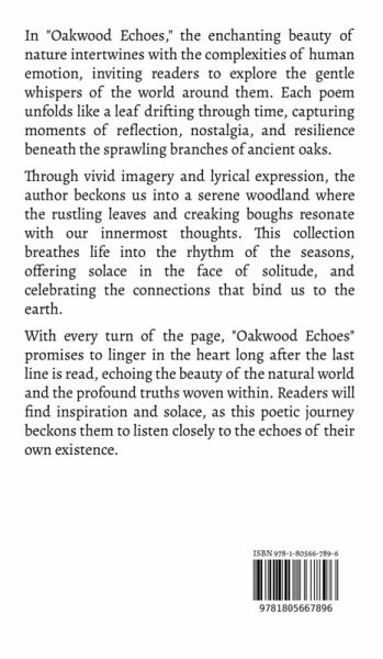 In "Oakwood Echoes," the enchanting beauty of nature intertwines with the complexities of human emotion, inviting readers to explore the gentle whispers of the world around them. Each poem unfolds like a leaf drifting through time, capturing moments of reflection, nostalgia, and resilience beneath the sprawling branches of ancient oaks. Through vivid imagery and lyrical expression, the author beckons us into a serene woodland where the rustling leaves and creaking boughs resonate with our innermost thoughts. This collection breathes life into the rhythm of the seasons, offering solace in the face of solitude, and celebrating the connections that bind us to the earth. With every turn of the page, "Oakwood Echoes" promises to linger in the heart long after the last line is read, echoing the beauty of the natural world and the profound truths woven within. Readers will find inspiration and solace, as this poetic journey beckons them to listen closely to the echoes of their own existence.