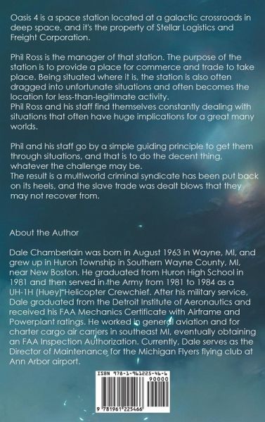 Oasis 4 is a space station located at a galactic crossroads in deep space, and it's the property of Stellar Logistics and Freight Corporation. Phil Ross is the manager of that station. The purpose of the station is to provide a place for commerce and trade to take place. Being situated where it is, the station is also often dragged into unfortunate situations and often becomes the location for less-than-legitimate activity. Phil Ross and his staff find themselves constantly dealing with situations that often have huge implications for a great many worlds. Phil and his staff go by a simple guiding principle to get them through situations, and that is to do the decent thing, whatever the challenge may be. The result is a multiworld criminal syndicate has been put back on its heels, and the slave trade was dealt blows that they may not recover from.