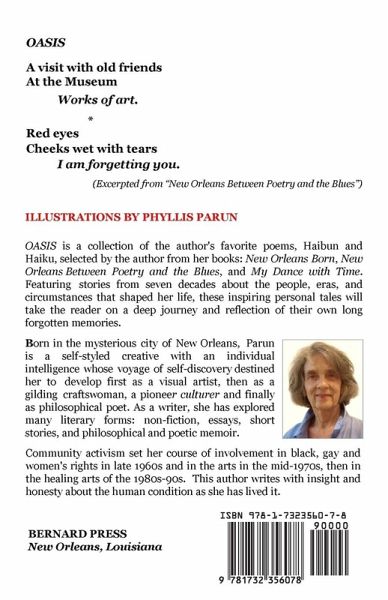 OASIS is a collection of the author's favorite poems, Haibun and Haiku to date, each selected by the author from her books: New Orleans Born the author's poetic homage to her childhood family influencers and he city of New Orleans, New Orleans Between Poetry and the Blues sarcastic humor about New Orleans to the year 2000, and My Dance With Time traversing seven decades of her life with autobiographical tales about the people, eras, and circumstances that shaped her character and life. These personal tales will surely inspire any reader who seeks a deeper understanding of their own lives to remember long forgotten memories. Phyllis Parun is a deeply honest author and a quintessential example of Cocteau's dictum that "writing should be an act of love otherwise its nothing but handwriting."
