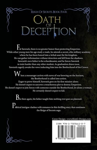 For Savenek, there is no greater honor than protecting Emperion. While other young men his age study a trade, he attends a secret, elite military academy where he has been honed into a lethal asset for his kingdom. He can gather information without detection and kill from the shadows. Savenek's own father is the schoolmaster, and he forces Savenek to train harder than any other student. As graduation draws near, Savenek eagerly awaits the vows inducting him into the Brotherhood of the Crown. When a messenger arrives with news of war brewing on the horizon, the Brotherhood is called into action. Eager to prove himself, Savenek goes on his first mission alone. He doesn't expect to uncover a treacherous plot to destroy Emperion. He doesn't expect to join forces with someone outside the Brotherhood, let alone a woman. He certainly doesn't expect to fail. But then again, his father taught him nothing ever goes as planned. Political intrigue clashes with romance in this thrilling story that continues the Reign of Secrets saga.