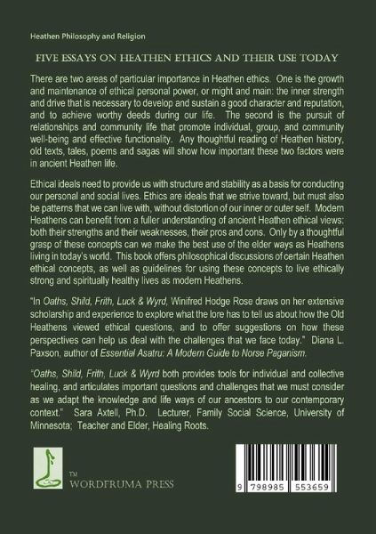 There are two areas of particular importance in Heathen ethics. One is the growth and maintenance of ethical personal power, or might and main: the inner strength and drive that is necessary to develop and sustain a good character and reputation, and to achieve worthy deeds during our life. The second is the pursuit of relationships and community life that promote individual, group, and community well-being and effective functionality. Any thoughtful reading of Heathen history, old texts, tales, poems and sagas will show how important these two factors were in ancient Heathen life. Ethical ideals need to provide us with structure and stability as a basis for conducting our personal and social lives. Ethics are ideals that we strive toward, but must also be patterns that we can live with, without distortion of our inner or outer self. Modern Heathens can benefit from a fuller understanding of ancient Heathen ethical views: both their strengths and their weaknesses, their pros and cons. Only by a thoughtful grasp of these concepts can we make the best use of the elder ways as Heathens living in today's world. This book offers philosophical discussions of certain Heathen ethical concepts, as well as guidelines for using these concepts to live ethically strong and spiritually healthy lives as modern Heathens. "Contemporary Heathenry is pretty good at making mead and getting together with the Gods, but what about the moral and ethical principles that most people expect from a religion? Some might say that Commandments are what we're trying to get away from, but inevitably a time comes when we need some guidance. In Oaths, Shild, Frith, Luck & Wyrd, Winifred Hodge Rose draws on her extensive scholarship and experience to explore what the lore has to tell us about how the Old Heathens viewed certain ethical questions, and to offer suggestions on how these perspectives can help us deal with the challenges that we face today." Diana L. Paxson, author of Essential Asatru: A Modern Guide to Norse Paganism. "Oaths, Shild, Frith, Luck & Wyrd both provides tools for individual and collective healing, and articulates important questions and challenges that we must consider as we adapt the knowledge and life ways of our ancestors to our contemporary context." Sara Axtell, Ph.D. Lecture,r Family Social Science, University of Minnesota; Teacher and Elder, Healing Roots.