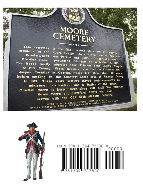 This "paperback" version offers all pages throughout in full color glossy library quality with many color photos and copies of old documents plus the large legible Historic Marker photo on the Moore Family on the back cover. Obadiah was born in Princess Anne County, Virginia under King George III and grew to manhood in the wild frontier of Pitt County, North Carolina. He enlisted in the North Carolina Continental Line in the Revolutionary War and fought in the Battle of Charleston under Gen. Benjamin Lincoln. He was captured, a Prisoner of War, and paroled. After the war was over,in 1783 he married Winney Ventis and the couple went "west", to Columbia County, Georgia, then Jasper County, Georgia and finally in 1819 to old Autauga County, Alabama, where he is buried in the old Moore Cemetery, an Alabama Historic Cemetery that today is in Chilton County. Alabama.