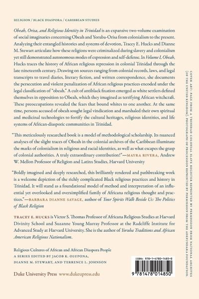 Obeah, Orisa, and Religious Identity in Trinidad is an expansive two-volume examination of social imaginaries concerning Obeah and Yoruba-Orisa from colonialism to the present. Analyzing their entangled histories and systems of devotion, Tracey E. Hucks and Dianne M. Stewart articulate how these religions were criminalized during slavery and colonialism yet still demonstrated autonomous modes of expression and self-defense. In Volume I, Obeah, Hucks traces the history of African religious repression in colonial Trinidad through the late nineteenth century. Drawing on sources ranging from colonial records, laws, and legal transcripts to travel diaries, literary fiction, and written correspondence, she documents the persecution and violent penalization of African religious practices encoded under the legal classification of "obeah." A cult of antiblack fixation emerged as white settlers defined themselves in opposition to Obeah, which they imagined as terrifying African witchcraft. These preoccupations revealed the fears that bound whites to one another. At the same time, persons accused of obeah sought legal vindication and marshaled their own spiritual and medicinal technologies to fortify the cultural heritages, religious identities, and life systems of African-diasporic communities in Trinidad.