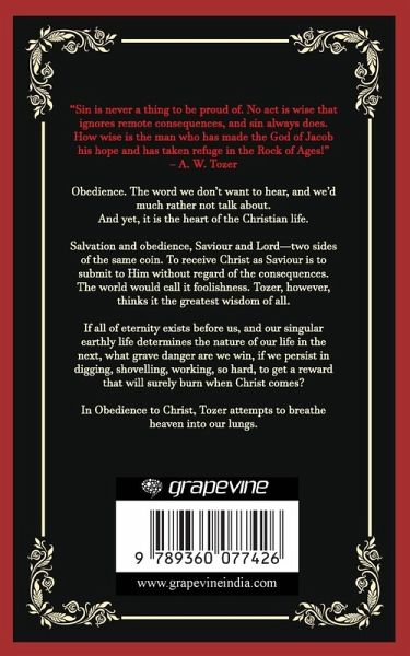 "Sin is never a thing to be proud of. No act is wise that ignores remote consequences, and sin always does. How wise is the man who has made the God of Jacob his hope and has taken refuge in the Rock of Ages!" - A. W. Tozer Obedience. The word we don't want to hear, and we'd much rather not talk about. And yet, it is the heart of the Christian life. Salvation and obedience, Saviour and Lord-two sides of the same coin. To receive Christ as Saviour is to submit to Him without regard of the consequences. The world would call it foolishness. Tozer, however, thinks it the greatest wisdom of all. If all of eternity exists before us, and our singular earthly life determines the nature of our life in the next, what grave danger are we win, if we persist in digging, shovelling, working, so hard, to get a reward that will surely burn when Christ comes? In Obedience to Christ, Tozer attempts to breathe heaven into our lungs.