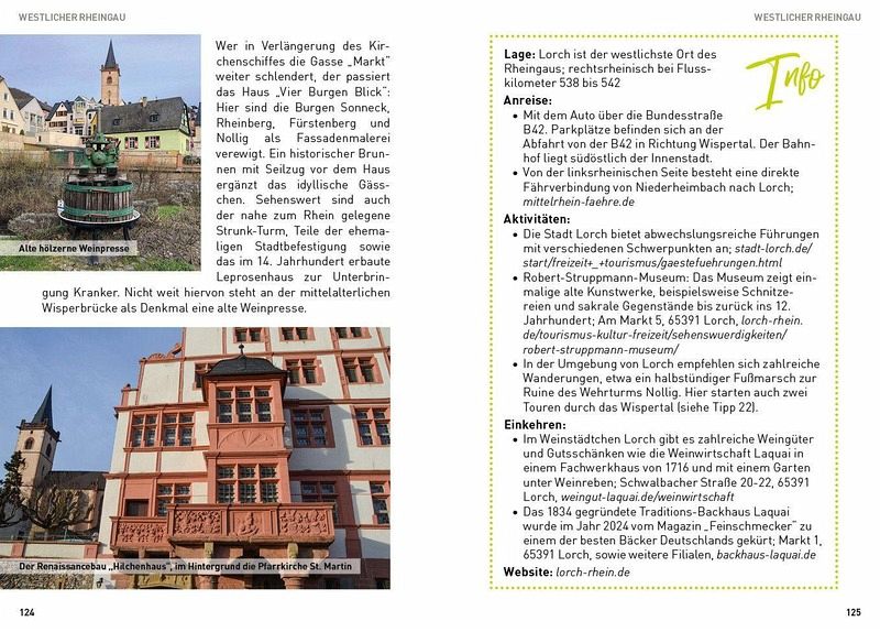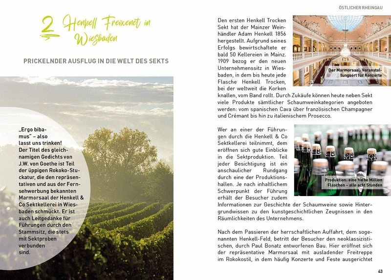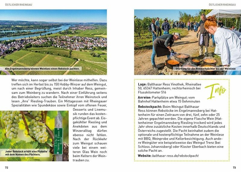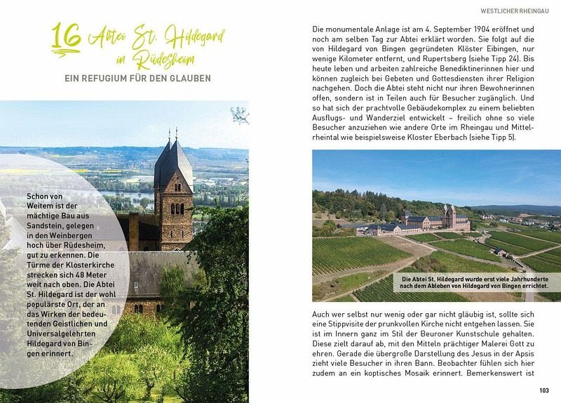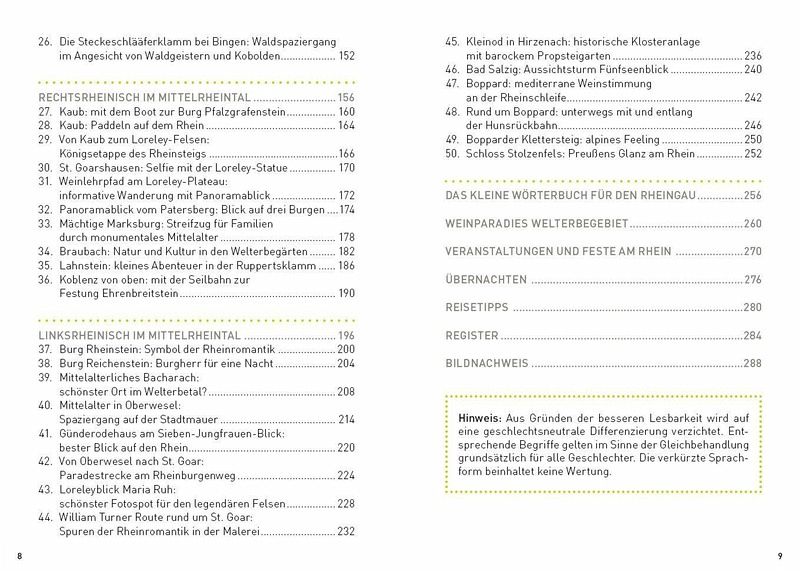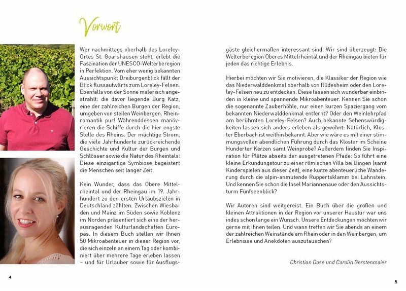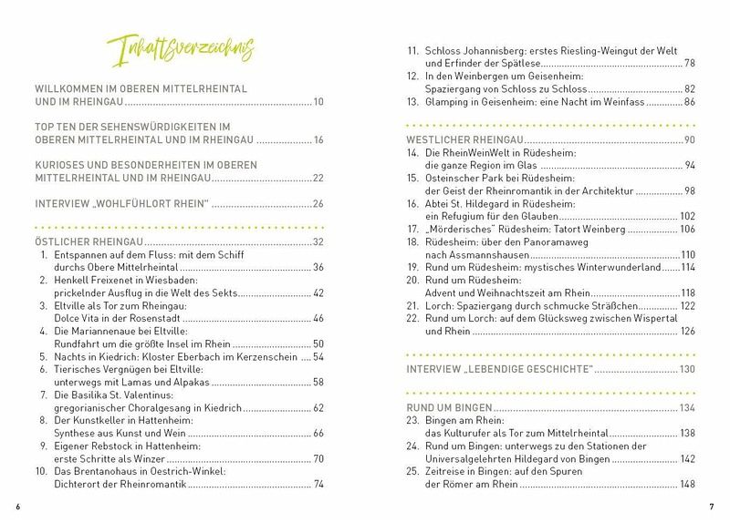 Ob romantische Burgen oder steile Weinberge: Über 67 Flusskilometer erstreckt sich entlang des Rheins eine der schönsten Kulturlandschaften Deutschlands. Das Obere Mittelrheintal, im Jahr 2002 als UNESCO-Weltkulturerbe ausgezeichnet, und der Rheingau faszinieren immer wieder aufs Neue. Kloster Eberbach ist spätestens seit dem Kinoerfolg "Der Name der Rose" weltweit bekannt, die Sage der Loreley ist es ohnehin. Doch es gibt weitaus mehr am vielleicht schönsten Abschnitt des Rheins zu entdecken.50 erlebnisreiche Mikroabenteuer stellen zwei gute Kenner der Region vor: von der nächtlichen Führung bei Kerzenschein und Weinprobe im Kloster Eberbach über Aussichtspunkte mit Wow-Faktor bis hin zu einer Kunstgalerie in einem historischen Weinkeller. Oder wie wäre es mit einer kurzen Wanderung mit Waldgeistern oder der Königsetappe des Rheinsteigs, einem Tag auf den Spuren von Hildegard von Bingen oder einer Übernachtung in einem überdimensionierten Weinfass?