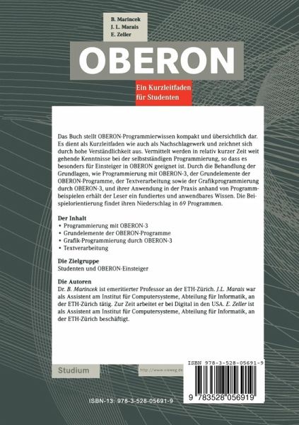 Das Buch stellt OBERON-Programmierwissen kompakt und übersichtlich dar. Es dient als Kurzleitfaden wie auch als Nachschlagewerk und zeichnet sich durch hohe Verständlichkeit aus. Vermittelt werden in relativ kurzer Zeit weit gehende Kenntnisse bei der selbstständigen Programmierung, so dass es besonders für Einsteiger in OBERON geeignet ist. Durch die Behandlung der Grundlagen, wie Programmierung mit OBERON-3, der Grundelemente der OBERON-Programme, der Textverarbeitung sowie der Grafikprogrammierung durch OBERON-3, und ihrer Anwendung in der Praxis anhand von Programmbeispielen erhält der Leser ein fundiertes und anwendbares Wissen. Die Beispielorientierung findet ihren Niederschlag in 69 Programmen.