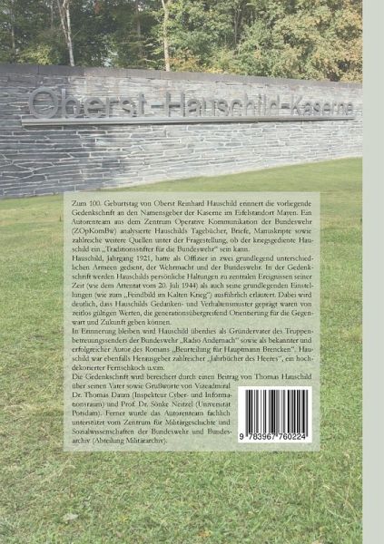 Zum 100. Geburtstag von Oberst Reinhard Hauschild erinnert die vorliegende Gedenkschrift an den Namensgeber der Kaserne im Eifelstandort Mayen. Ein Autorenteam aus dem Zentrum Operative Kommunikation der Bundeswehr analysierte Hauschilds Tagebücher, Briefe, Manuskripte sowie zahlreiche weitere Quellen unter der Fragestellung, ob der kriegsgediente Hau schild ein Traditionsstifter für die Bundeswehr sein kann. Hauschild, Jahrgang 1921, hatte als Offizier in zwei grundlegend unterschied lichen Armeen gedient, der Wehrmacht und der Bundeswehr. In der Gedenk schrift werden Hauschilds persönliche Haltungen zu zentralen Ereignissen seiner Zeit wie dem Attentat vom 20. Juli 1944 als auch seine grundlegenden Einstel lungen wie zum Feindbild im Kalten Krieg ausführlich erläutert. Dabei wird deutlich, dass Hauschilds Gedanken- und Verhaltensmuster geprägt waren von zeitlos gültigen Werten, die generationsübergreifend Orientierung für die Gegen wart und Zukunft geben können. In Erinnerung bleiben wird Hauschild überdies als Gründervater des Truppen betreuungssenders der Bundeswehr Radio Andernach sowie als bekannter und erfolgreicher Autor des Romans Beurteilung für Hauptmann Brencken. Hau schild war ebenfalls Herausgeber zahlreicher Jahrbücher des Heeres, ein hoch dekorierter Fernsehkoch u.v.m. Die Gedenkschrift wird bereichert durch einen Beitrag von Thomas Hauschild über seinen Vater sowie Grußworte von Vizeadmiral Dr. Thomas Daum, Inspekteur Cyber- und Informa tionsraum, und Prof. Dr. Sönke Neitzel, Universität Potsdam. Ferner wurde das Autorenteam fachlich unterstützt vom Zentrum für Militärgeschichte und Sozialwissenschaften der Bundeswehr und Bundes archiv, Abteilung Militärarchiv.