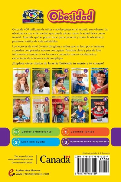 Cerca de 400 millones de niños y adolescentes en el mundo son obesos. La obesidad es una enfermedad que puede afectar tanto la salud física como mental. Aprende qué se puede hacer para prevenir y tratar la obesidad y promover estilos de vida saludables. Los lectores de nivel 3 están dirigidos a niños que ya leen por sí mismos y pueden comprender nuevos conceptos. Palabras clave y pies de foto informativos ayudan a los lectores a entender nuevo vocabulario y estructuras de oraciones más complejas. Este proyecto ha sido posible en parte gracias al Gobierno de Canadá.