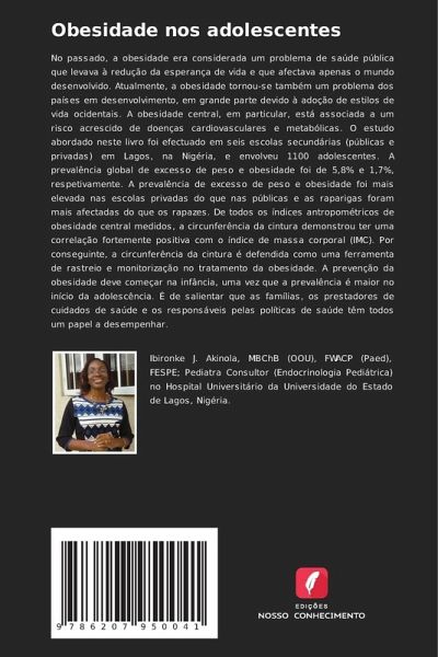 No passado, a obesidade era considerada um problema de saúde pública que levava à redução da esperança de vida e que afectava apenas o mundo desenvolvido. Atualmente, a obesidade tornou-se também um problema dos países em desenvolvimento, em grande parte devido à adoção de estilos de vida ocidentais. A obesidade central, em particular, está associada a um risco acrescido de doenças cardiovasculares e metabólicas. O estudo abordado neste livro foi efectuado em seis escolas secundárias (públicas e privadas) em Lagos, na Nigéria, e envolveu 1100 adolescentes. A prevalência global de excesso de peso e obesidade foi de 5,8% e 1,7%, respetivamente. A prevalência de excesso de peso e obesidade foi mais elevada nas escolas privadas do que nas públicas e as raparigas foram mais afectadas do que os rapazes. De todos os índices antropométricos de obesidade central medidos, a circunferência da cintura demonstrou ter uma correlação fortemente positiva com o índice de massa corporal (IMC). Por conseguinte, a circunferência da cintura é defendida como uma ferramenta de rastreio e monitorização no tratamento da obesidade. A prevenção da obesidade deve começar na infância, uma vez que a prevalência é maior no início da adolescência. É de salientar que as famílias, os prestadores de cuidados de saúde e os responsáveis pelas políticas de saúde têm todos um papel a desempenhar.