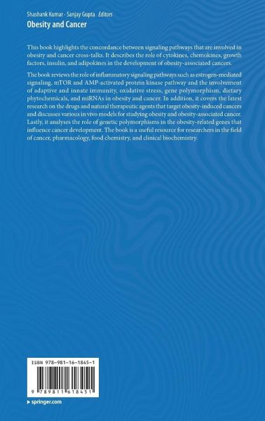The book reviews the role of inflammatory signaling pathways such as estrogen-mediated signaling, mTOR and AMP-activated protein kinase pathway and the involvement of adaptive and innate immunity, oxidative stress, gene polymorphism, dietary phytochemicals, and miRNAs in obesity and cancer. In addition, it covers the latest research on the drugs and natural therapeutic agents that target obesity-induced cancers and discusses various in vivo models for studying obesity and obesity-associated cancer. Lastly, it analyses the role of genetic polymorphisms in the obesity-related genes that influence cancer development. The book is a useful resource for researchers in the field of cancer, pharmacology, food chemistry, and clinicalbiochemistry.