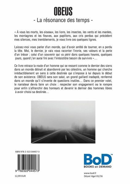 « À vous les morts, les oiseaux, les lions, les insectes, les vents et les marées, les montagnes et les fleuves, aux papillons, aux cris perdus qui précèdent mes silences, mes tremblements, je vous livre ces quelques lignes.Laissez-moi vous parler d'un monde, qui d'avoir arrêté de tourner, en a perdu la tête. Moi, le dernier, je vais vous raconter l'ironie, ses valeurs et la perte d'un trésor ; celui d'un souvenir qui va périr dans quelques heures, quelques jours, quand j'en aurai fini avec l'irrésistible besoin de survivre »...Ce livre retrace la route d'un homme qui se ressent comme le dernier des siens dans un monde détruit et abandonné par les célestins, un homme qui cherche irréductiblement un sens à cette destinée qui s'impose à lui depuis le début de son existence. OBEUS sera son salut, un grand gaillard inadapté, renfermé dans un monde qu'il s'invente de questions inutiles... Dans ce premier volet, le narrateur devra faire un choix : respecter son engagement ou le rompre pour enfin s'affranchir des horreurs et devenir le dernier des hommes libres à avoir choisi sa destinée...