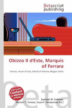 Please note that the content of this book primarily consists of articles available from Wikipedia or other free sources online. Obizzo II d''Este (b. ca. 1247 d. 13 February 1293) was Marquis of Ferrara and the March of Ancona. He was a bastard, the fruit of an illegitimate relation of Rinaldo I d''Este -the only son and heir of the Margrave Azzo VII d''Este- with a napolitan laundress. Soon after his birth, Obizzo was expelled from Ferrara with his mother and settled in Ravenna. For his condition, Obizzo was destined to an obscure future; nevertheless, this situation changed in 1251: his father Rinaldo, a hostage of the Emperor Frederick I since 1238, was poisoned with his barren wife, Adelaida da Romano. Without any other sons to continue his line, the Margrave Azzo VII saw in Obizzo the only chance of survival of the House of Este and fought for his recognition as his heir. Obizzo was legitimated by the Pope in 1252, shortly after his mother was drowned in the Adriatic.