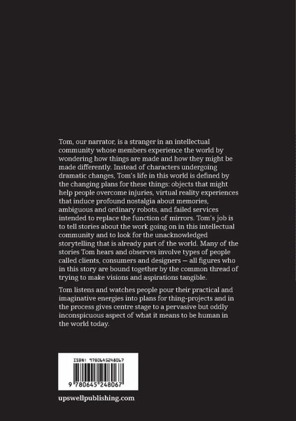 Tom, our narrator, is a stranger in an intellectual community whose members experience the world by wondering how things are made and how they might be made differently. Instead of characters undergoing dramatic changes, Tom's life in this world is defined by the changing plans for things:objects that might help people overcome injuries, virtual reality experiences that induce profound nostalgia about memories, ambiguous and ordinary robots, and failed services intended to replace the function of mirrors. Tom's job is to tell stories about the work going on in this intellectual community and to look for the unacknowledged storytelling that is already part of the world. Many of the stories Tom hears and observes involve types of people called clients, consumers and designers-all figures who in this story are bound together by the common thread of trying to make visions and aspirations tangible. Tom listens and watches people pour their practical and imaginative energies into plans for thing-projects and in the process gives centre stage to a pervasive but oddly inconspicuous aspect of what it means to be human in the world today.