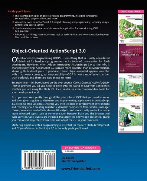 This book, based on the ever-popular Object-Oriented ActionScript for Flash 8, provides you all you need to delve into the world of OOP with confidence, whether you are using the Flash IDE, Flex builder, or even command-line tools for your development work.