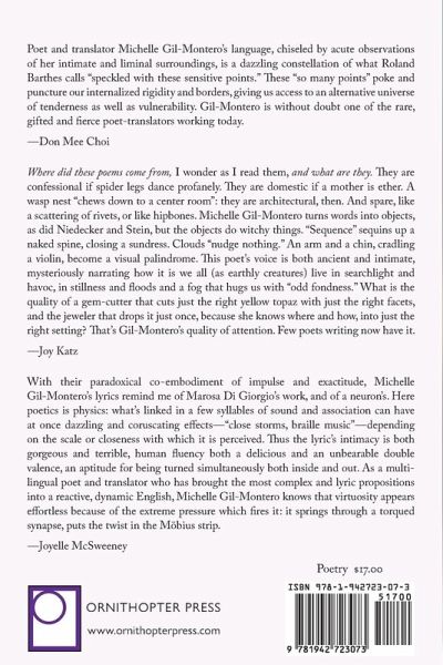 "Object permanence" refers to the early developmental stage in which the child learns that the world exists independently of one's own ability to perceive it. In this, her first full-length collection of poems, Michelle Gil-Montero unveils the elusive debris of daily life in order to invoke, paradoxically, its impermanence. These poems summon the liminal world of early motherhood, of early morning, of seasons in transition. Inhabiting a terrain of post-industrial landscapes at once familiar and not-a space where what isn't encroaches on what is-Gil-Montero's pitch-perfect, emotionally resonant lyric lines pressure the expressive possibilities of language. Sound hovers on the verge of becoming object. Object threatens to evaporate into sound.