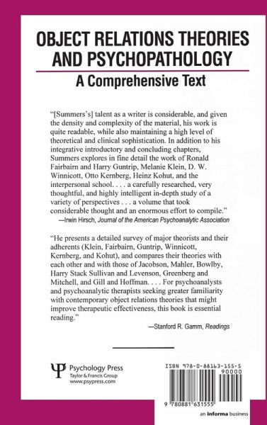 Object relations theories, both British and American, have achieved increasing prominence in recent years as the limitations of the classical psychoanalytic model have become more apparent. Despite the plethora of books written from an object relations perspective, there has to date been no textbook describing and comparing the various theories with a focus on their clinical applications. Object Relations Theories and Psychopathology: A Comprehensive Text brilliantly fills this gap in the literature. Frank Summers provides thorough, lucid, and critically informed accounts of the work of each of the major object relations theorists: Fairbairn, Guntrip, Melanie Klein, Winnicott, Kernberg, and Kohut. His expositions achieve distinction on two counts. First, the work of each object relations theorist is presented as a comprehensive whole, with separate sections of each chapter expounding the theorist's ideas and assumptions about metapsychology, development, psychopathology, and treatment. Summers concludes each account with a critical evaluation of the strengths and limitations of the theory in question. Second, the emphasis in each chapter is on issues of clinical understanding and technique. Making extensive use of case material provided by each of the theorists, he shows how each object relations theory yields specific clinical approaches to a variety of syndromes, and how these approaches, in turn, entail specific modifications in clinical technique. Beyond his detailed attention to the theoretical and technical differences among object relations theories, Summers offers two concluding chapters that highlight the broad commonalities that link all object relations theories and set themapart from other contemporary approaches. His penultimate chapter discusses the similarities and differences of object relations and interpersonal theories. And his concluding chapter outlines a pragmatic object relations approach to development, psychopathology, and technique that combines elements of all object relations theories without opting for any single theory. Object Relations Theories and Psychopathology is that rare event in psychoanalytic publishing: a substantive, readable text that surveys a broad expanse of the theoretical and clinical landscape with erudition, sympathy, and critical perspective. It will be essential reading for all analysts, psychologists, psychiatrists, and social workers who wish to familiarize themselves with object relations theories in general, sharpen their understanding of the work of specific object relations theorists, or enhance their ability to employ these theories in their clinical work.