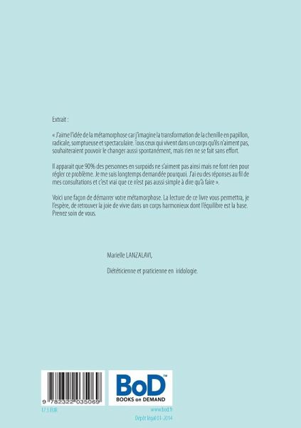 Extrait : " J aime l idée de la métamorphose car j imagine la transformation de la chenille en papillon, radicale, somptueuse et spectaculaire. Tous ceux qui vivent dans un corps qu ils n aiment pas souhaiteraient pouvoir le changer aussi spontanément, mais rien ne se fait sans effort. Il apparait que 90% des personnes en surpoids ne s aiment pas ainsi mais ne font rien pour régler ce problème. Je me suis longtemps demandée pourquoi. J ai eu des réponses au fil de mes consultations...".