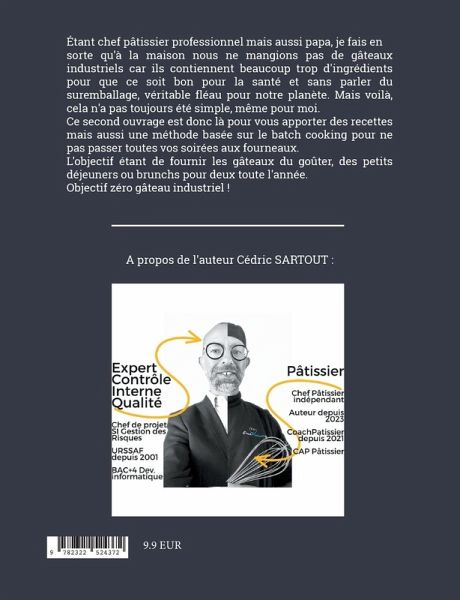 Étant chef pâtissier professionnel mais aussi papa, je fais en sorte qu'à la maison nous ne mangions pas de gâteaux industriels car ils contiennent beaucoup trop d'ingrédients pour que ce soit bon pour la santé et sans parler du suremballage, véritable fléau pour notre planète. Mais voilà, cela n'a pas toujours été simple, même pour moi.Ce second ouvrage est donc là pour vous apporter des recettes mais aussi une méthode basée sur le batch cooking pour ne pas passer toutes vos soirées aux fourneaux.L'objectif étant de fournir les gâteaux du goûter, des petits déjeuners ou brunchs pour deux toute l'année.Objectif zéro gâteau industriel !