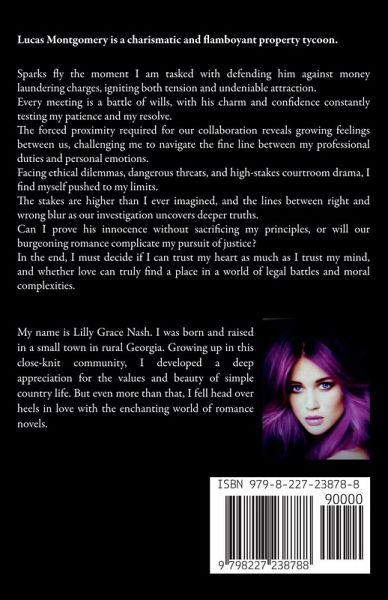 Lucas Montgomery is a charismatic and flamboyant property tycoon. Sparks fly the moment I am tasked with defending him against money laundering charges, igniting both tension and undeniable attraction. Every meeting is a battle of wills, with his charm and confidence constantly testing my patience and my resolve. The forced proximity required for our collaboration reveals growing feelings between us, challenging me to navigate the fine line between my professional duties and personal emotions. Facing ethical dilemmas, dangerous threats, and high-stakes courtroom drama, I find myself pushed to my limits. The stakes are higher than I ever imagined, and the lines between right and wrong blur as our investigation uncovers deeper truths. Can I prove his innocence without sacrificing my principles, or will our burgeoning romance complicate my pursuit of justice? In the end, I must decide if I can trust my heart as much as I trust my mind, and whether love can truly find a place in a world of legal battles and moral complexities.