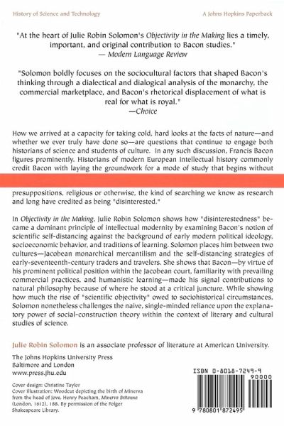 How we arrived at a capacity for taking cold, hard looks at the facts of nature -- and whether we ever truly have done so -- are questions that continue to engage both historians of science and students of culture. Historians of modern European intellectual history commonly credit Francis Bacon with laying the groundwork for a mode of study that begins without presuppositions, religious or otherwise, the kind of searching we know as research and long have credited as being "disinterested." In Objectivity in the Making, Julie Robin Solomon shows how "disinterestedness" became a dominant principle of intellectual modernity by examining Bacon's notion of scientific self-distancing against the background of early modern political ideology, socioeconomic behavior, and traditions of learning. Solomon places him between two cultures -- Jacobean monarchical mercantilism and the self-distancing strategies of early-seventeenth-century traders and travelers. She shows that Bacon -- by virtue of his prominent political position within the Jacobean court, familiarity with prevailing commercial practices, and humanistic learning -- made his signal contributions to natural philosophy because of where he stood at a critical juncture.